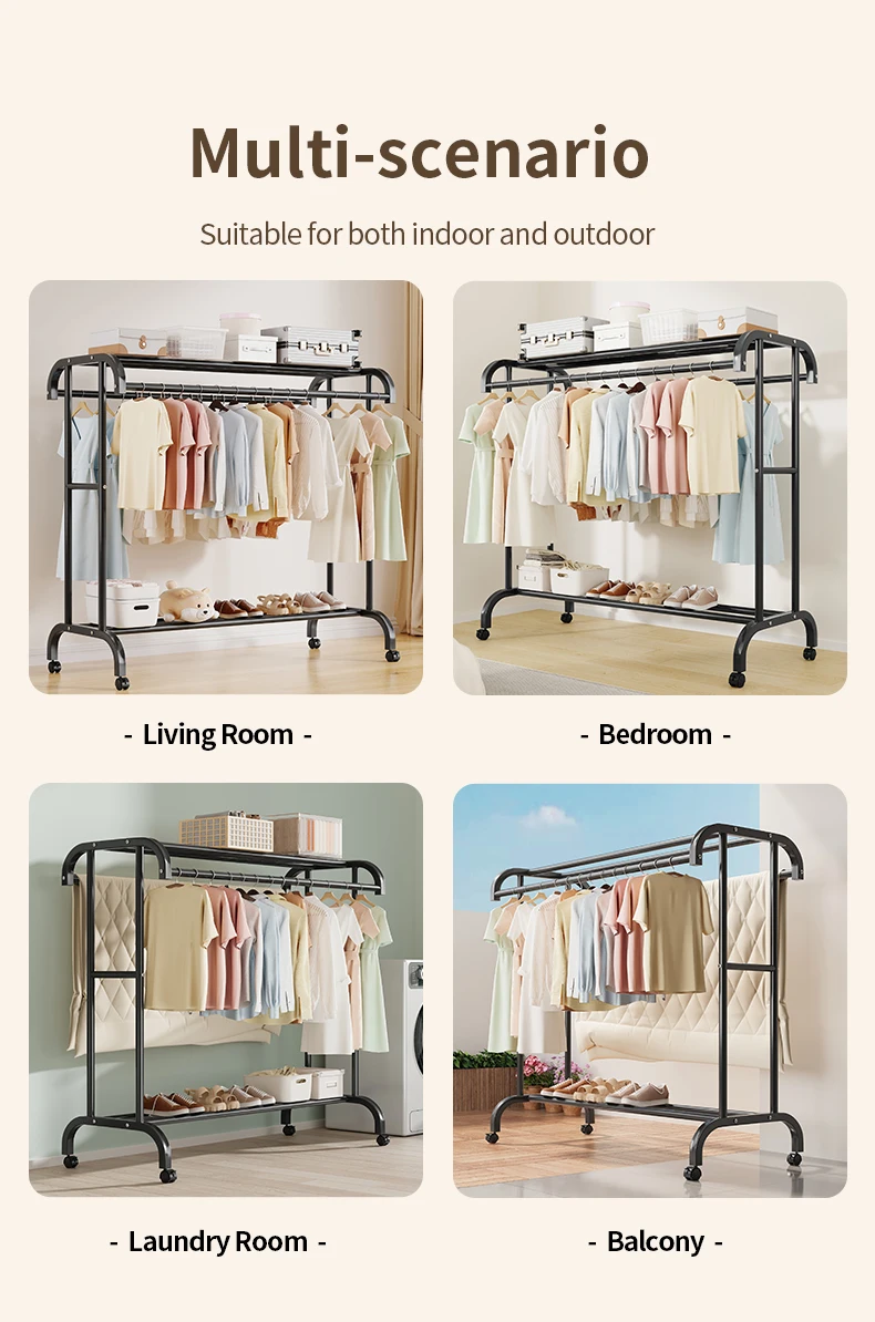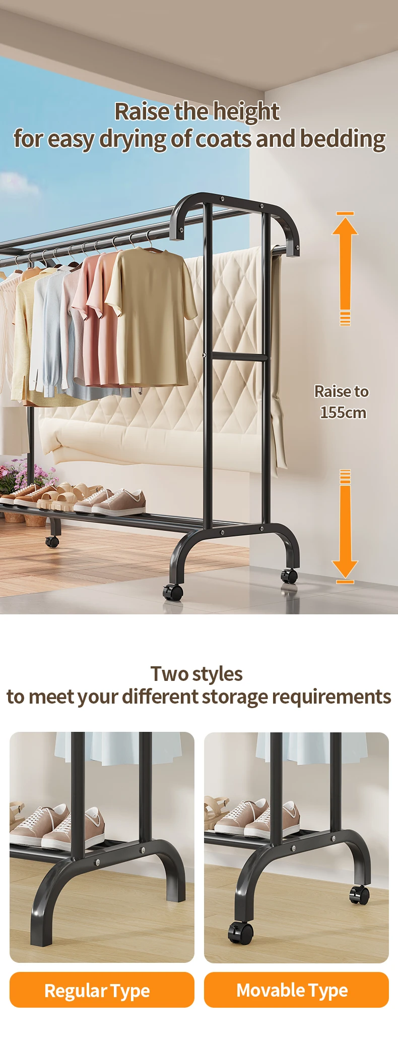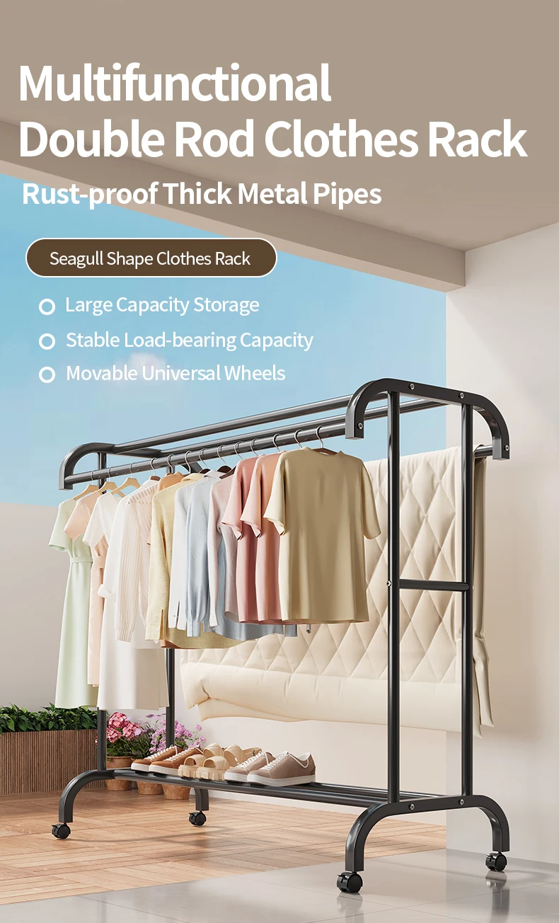Ce portant à vêtements en métal robuste, équipé de roulettes pour un transport facile, est doté de deux tringles à vêtements, d'une étagère supérieure pour le rangement et d'une étagère inférieure pour les chaussures ou les boîtes. Son design pratique et moderne offre un espace supplémentaire pour ranger vêtements et accessoires dans une chambre ou un magasin.