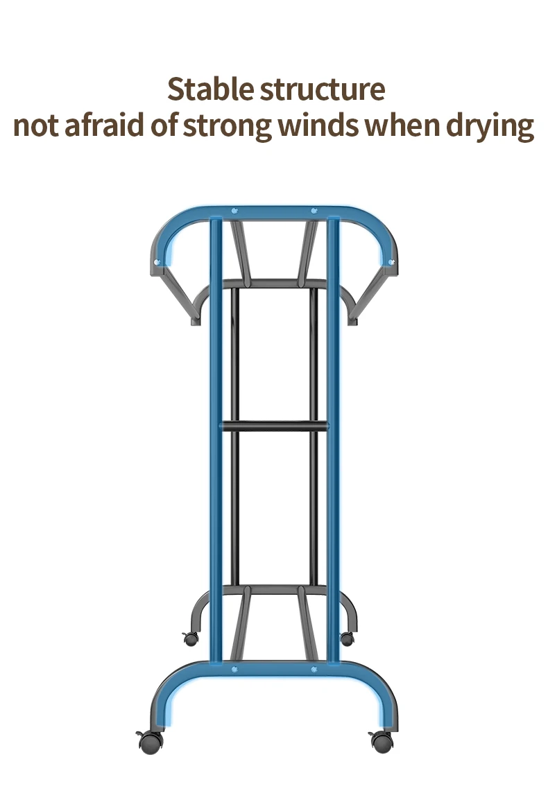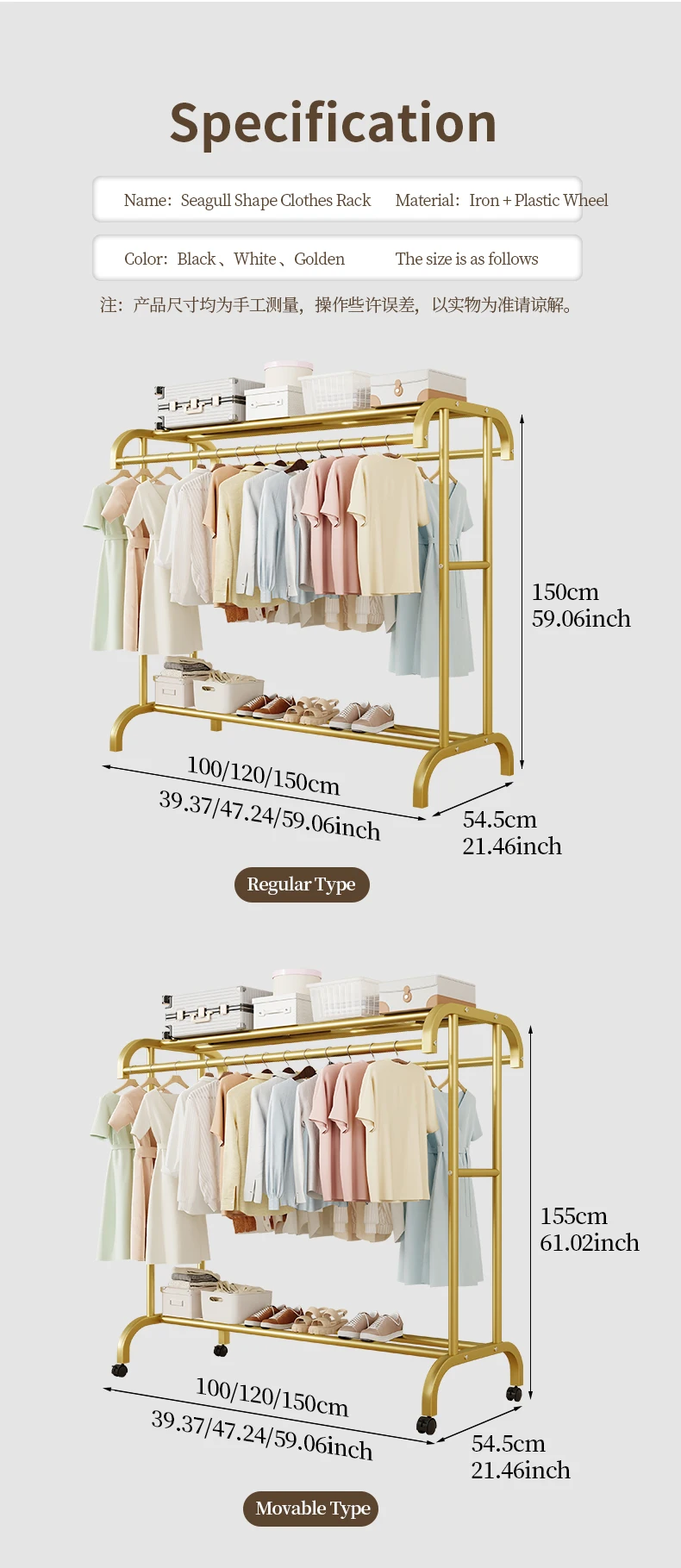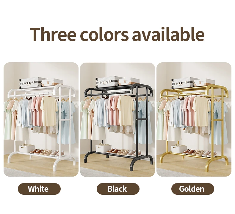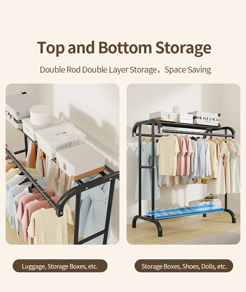 Ce portant à vêtements en métal robuste, équipé de roulettes pour un transport facile, est doté de deux tringles à vêtements, d'une étagère supérieure pour le rangement et d'une étagère inférieure pour les chaussures ou les boîtes. Son design pratique et moderne offre un espace supplémentaire pour ranger vêtements et accessoires dans une chambre ou un magasin.