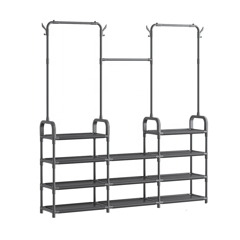 Description : Un cintre multifonctionnel au design moderne et élégant, fabriqué avec un cadre en métal blanc résistant. Il offre un grand espace pour suspendre les vêtements, avec plusieurs étagères pour ranger chaussures, sacs, boîtes et accessoires. Idéal pour les chambres, les entrées ou les magasins, il permet d'organiser et de ranger les articles avec soin.