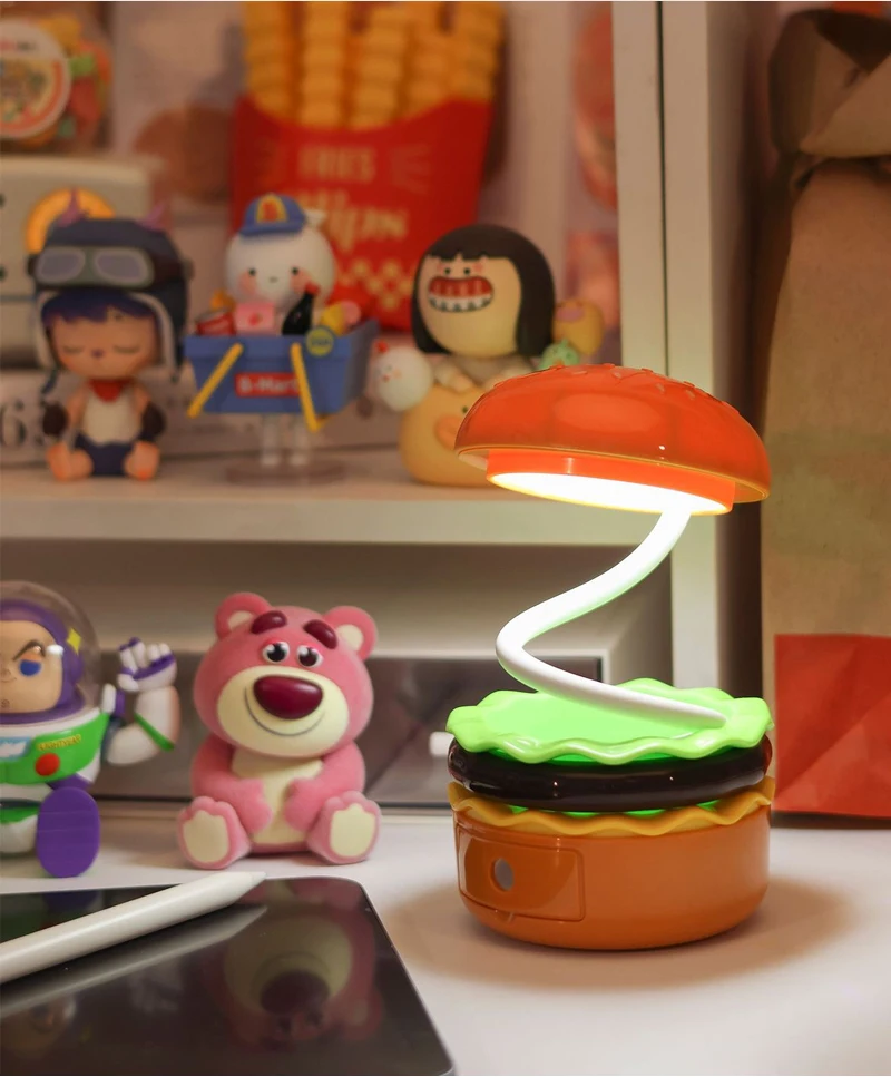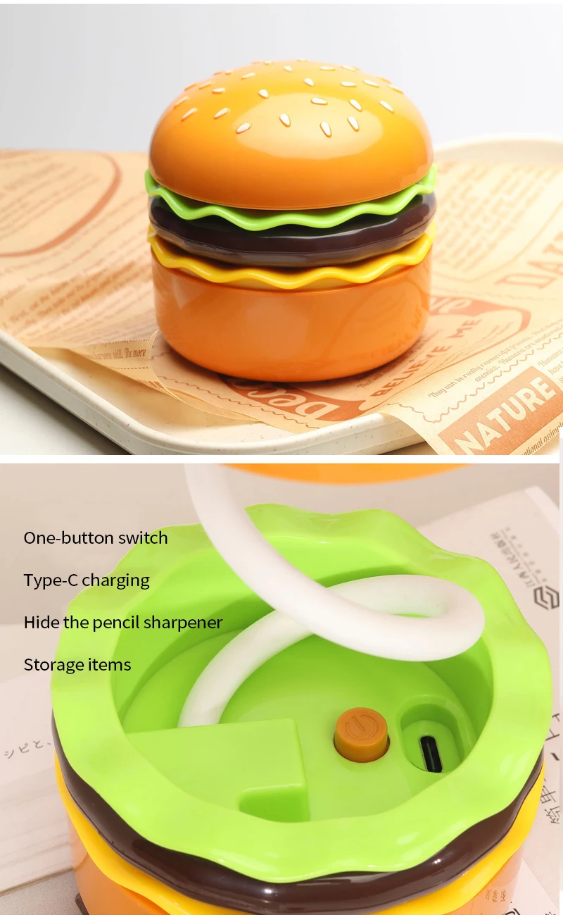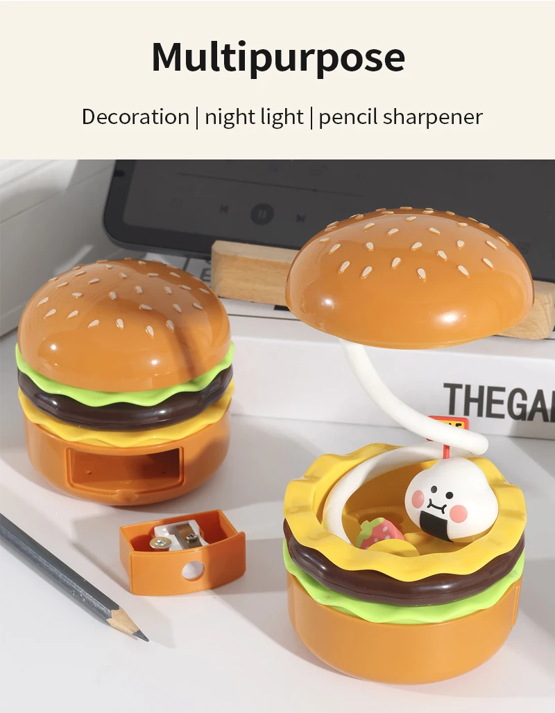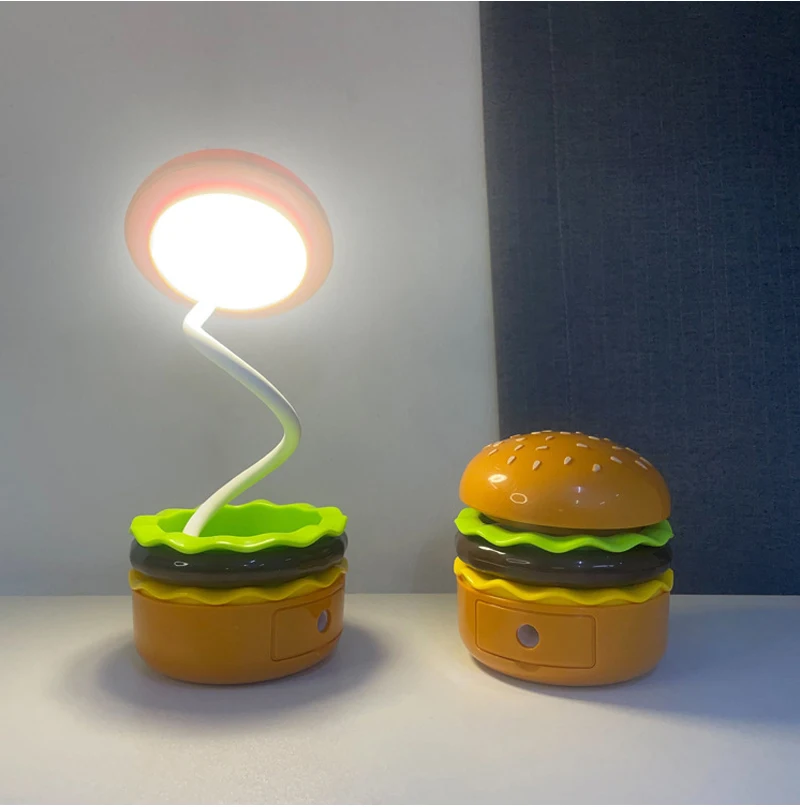 Cette veilleuse LED sur le thème du hamburger combine un taille-crayon, un espace de rangement et une lampe de bureau réglable pour étudier ou lire. Fonctionne à piles.